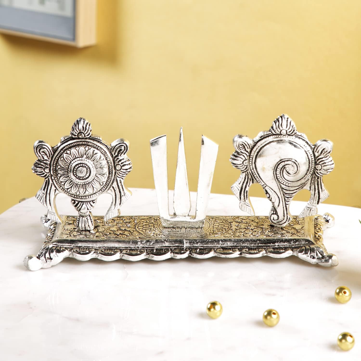 Amazon Brand – Umi Metal Tirupati Balaji Shankh Chakra Tilak Showpiece, Vishnu Symbol on Base, Venkateshwara Balaji Symbol Shankh Chakra Tilak Home Temple, Office Tabletop (9.2 Inches Length, Silver)