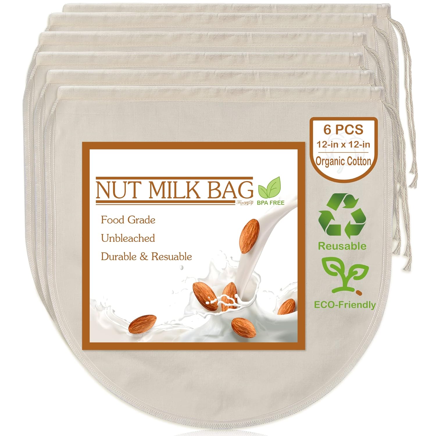 6 Pack 12″x12″ Nut Milk Bags – 100% Unbleached Organic Cotton Cheesecloth, Reusable Food Strainer Colander For Straining Almond/Oat Milk, Celery Juice, Cold Brew Coffee, Yogurt and Cheese Making