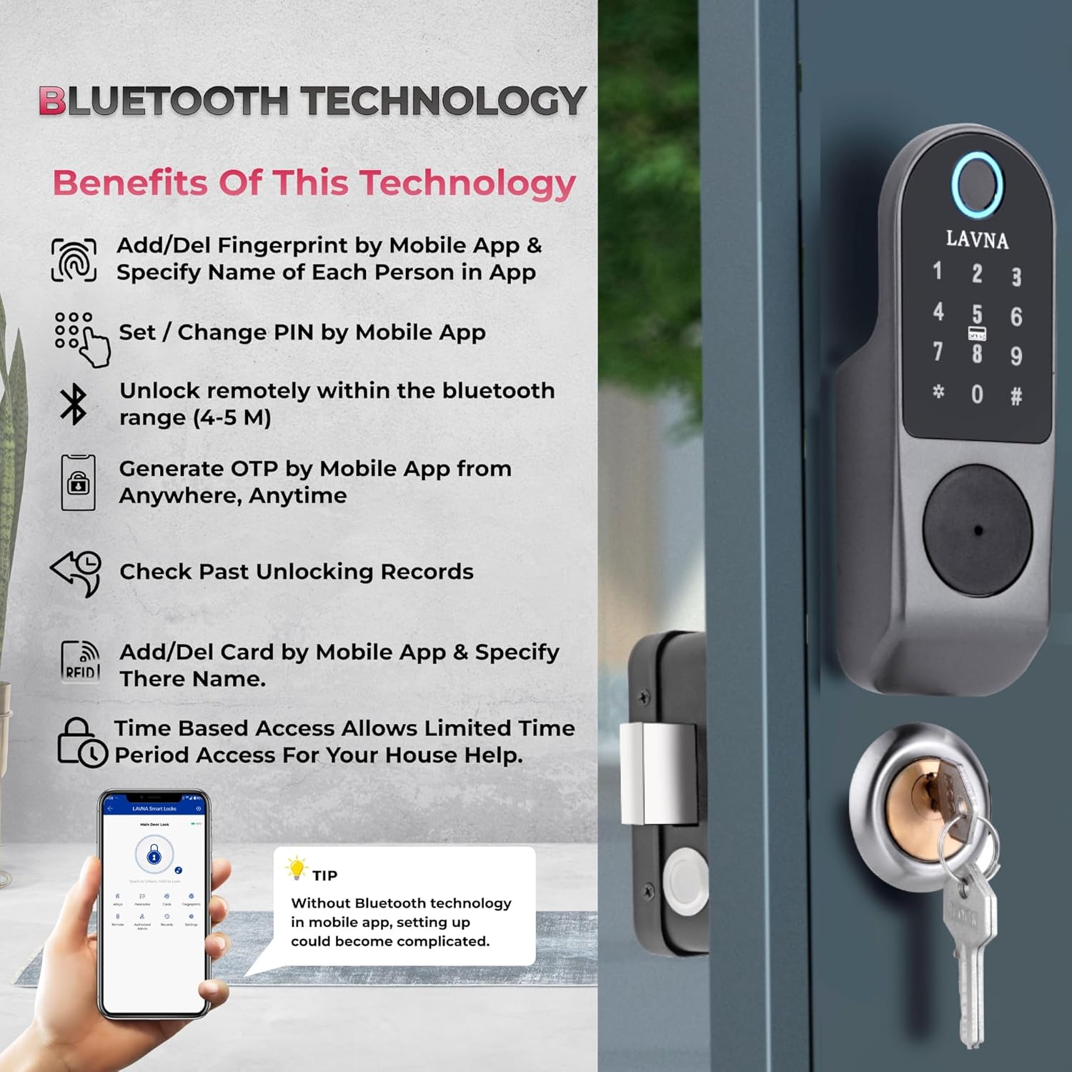 LAVNA LE50 Smart Electronic Metal Door Lock with Bluetooth Mobile App, Fingerprint, RFID Card, PIN and Manual Key Access for Metal Doors | Smart Door Lock for Home & Office (Black & Grey)