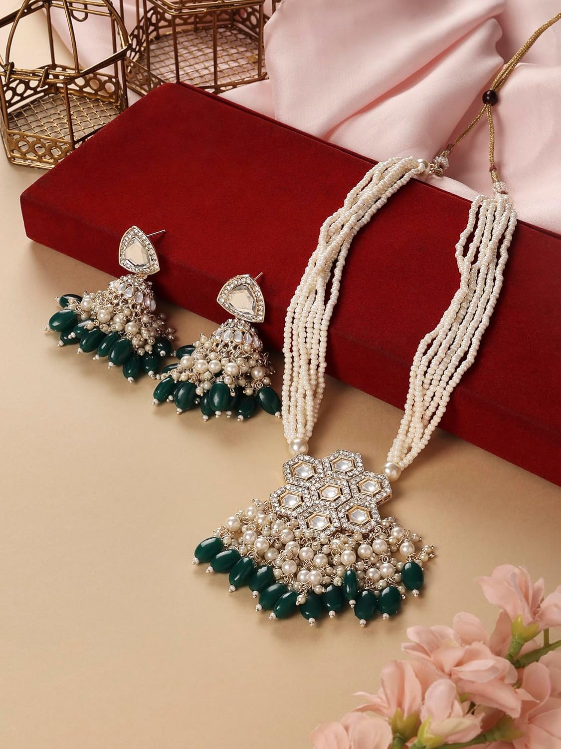ZAVERI PEARLS Green Stones Long Multistrand Beaded Necklace Earring & Ring Set For Women-ZPFK16585