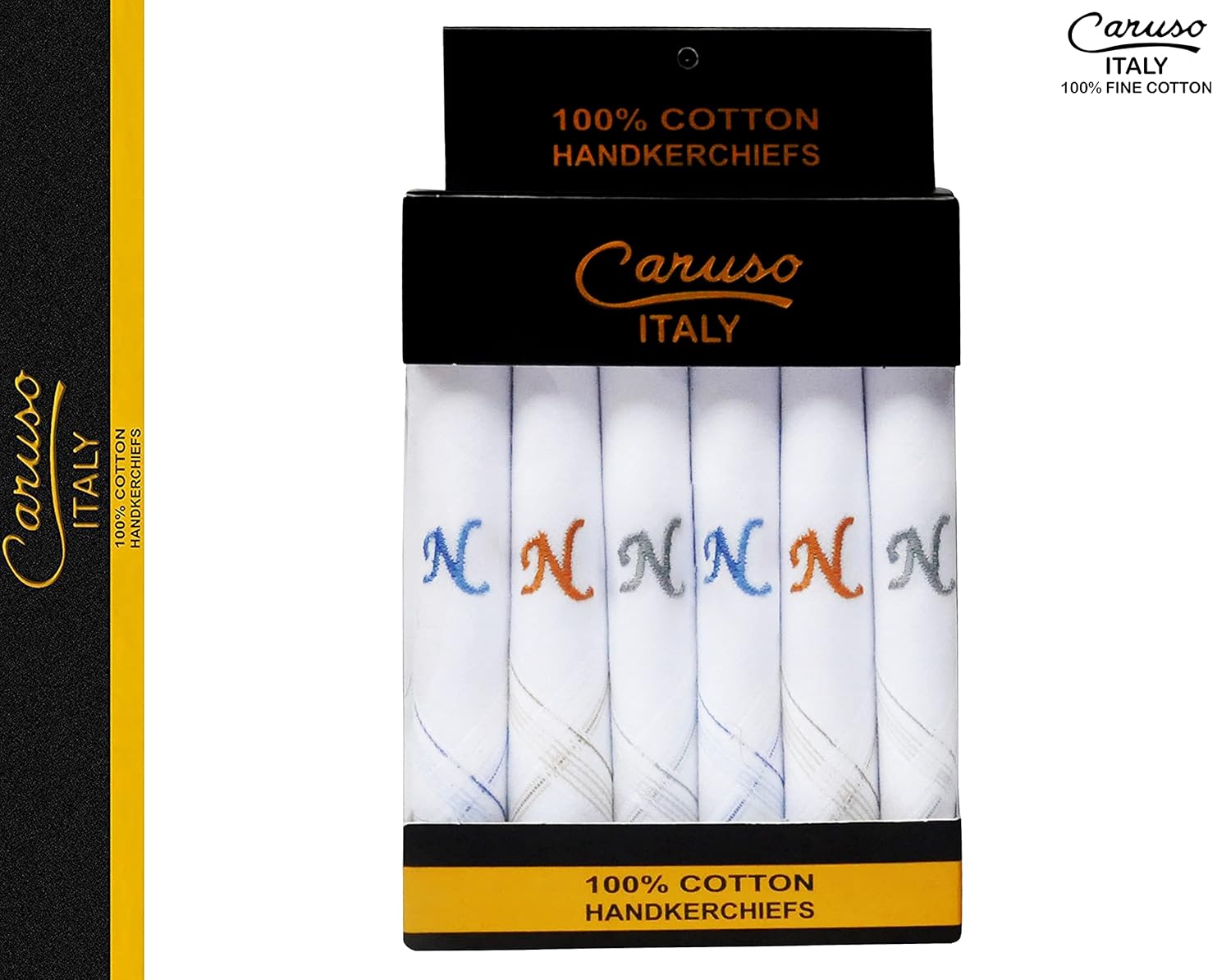 Caruso Italy Men’s Initial Monogram (A-Z) Embroidery 100% Pure Cotton Handkerchief White Base With Colored Border – Pack Of 6