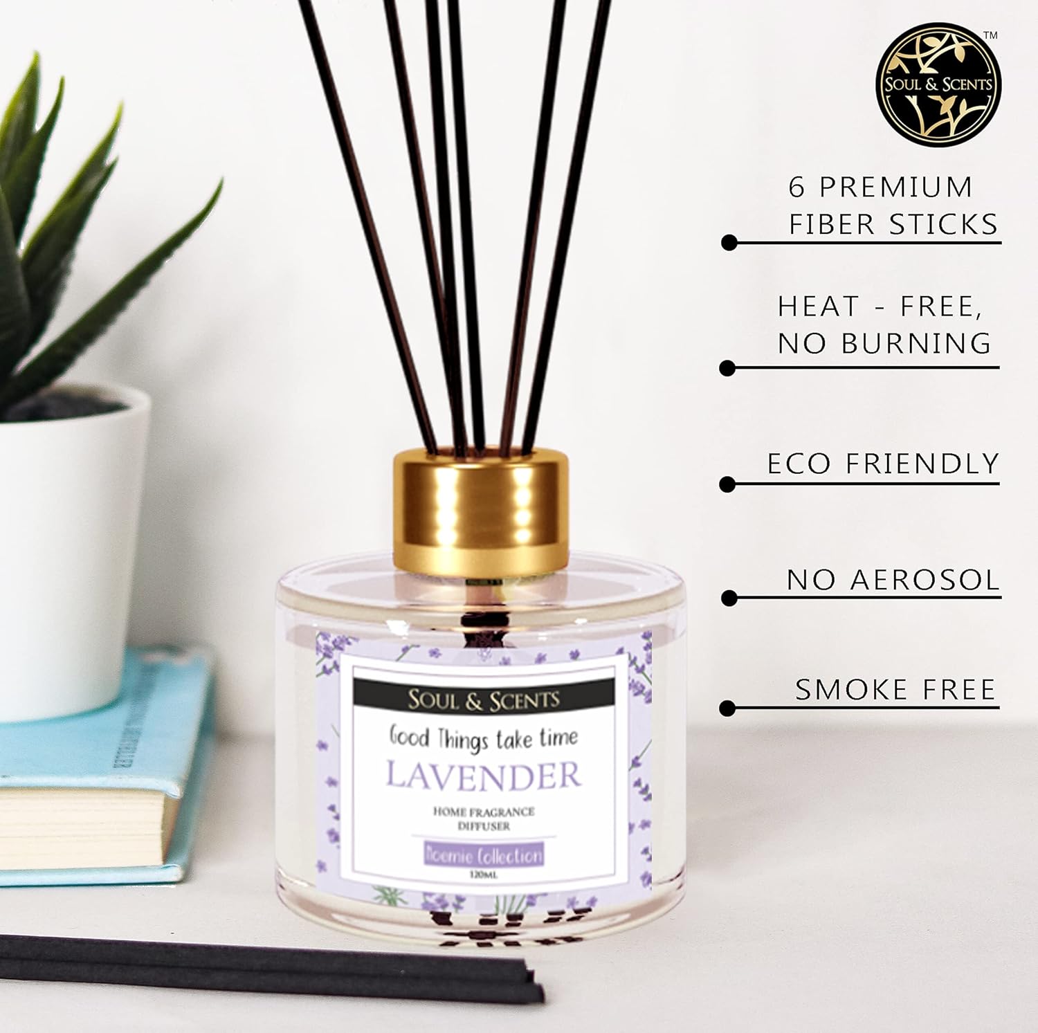 Soul & Scents 120 Ml Lavender Reed Diffuser Set | Free 6 Fiber Reed Sticks | Stress Relief & Aromatherapy | Long-Lasting, Smoke-Free Air Freshener for Home, Bedroom and Office | Ideal for Gifting