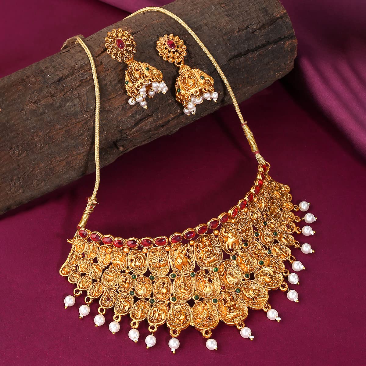 Yellow Chimes Jewellery Set for Women Gold Plated Traditional Temple Jewelry Set Antique Necklace Set with Earrings and Maangtikka for Women and Girls
