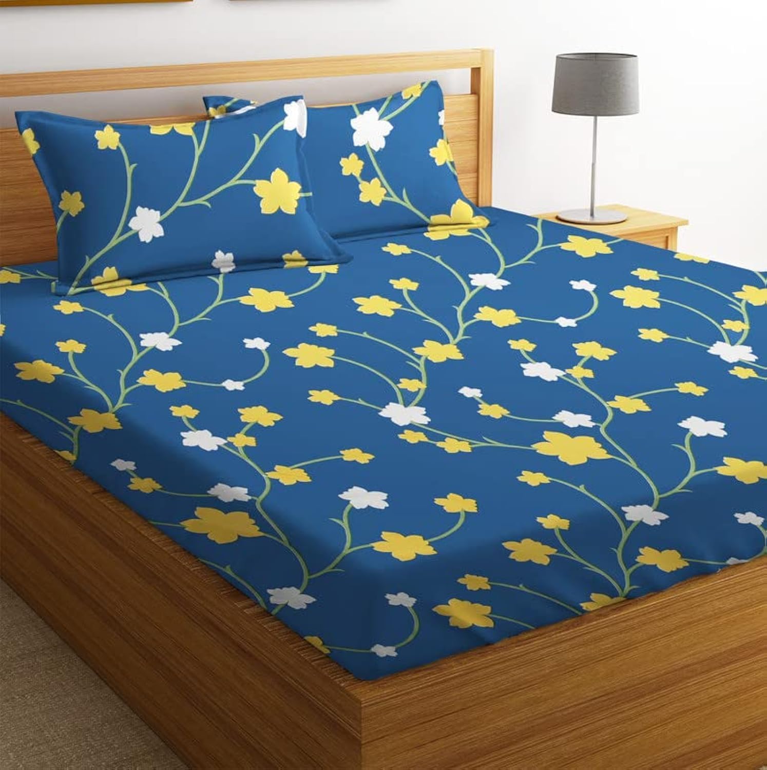 BSB HOME 100% Microfiber bedsheet for Double Bed with 2 Pillow Covers Breathable | Wrinklefree and Softtouch Floral Print Sheet- White Yellow & Blue