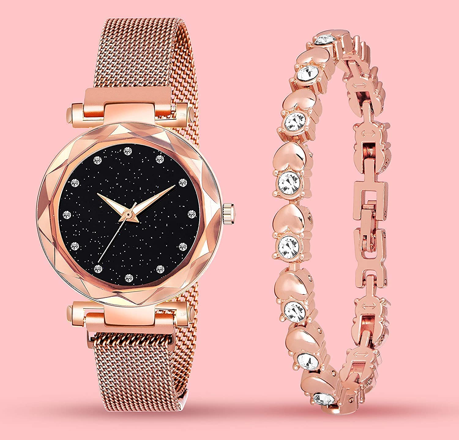 Goldenize fashion Sparkling 12 Diamonds Rose Gold Magnet Belt Analog Watch and Bracelet Combo for Girls and Women