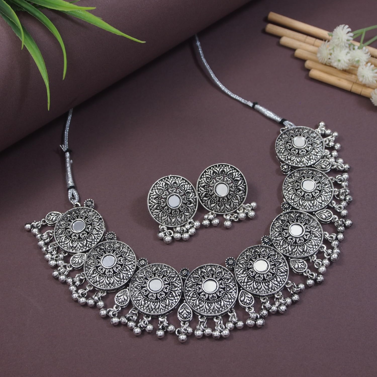 I Jewels Navratri Ethnic Silver Oxidized Traditional Afghani Choker Necklace Jewellery Set for Women (MC135OX-40-41) (Style3)
