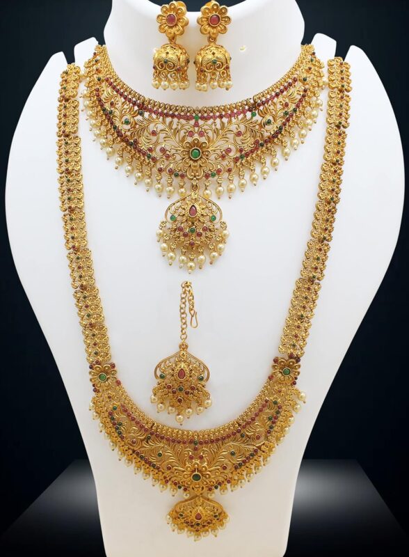 Nagneshi Art Gold Plated Traditional Bridal Long & Choker Necklace With Jhumki/Jhumka Earrings & Maang Tikka Jewellery Set For Women/Girls