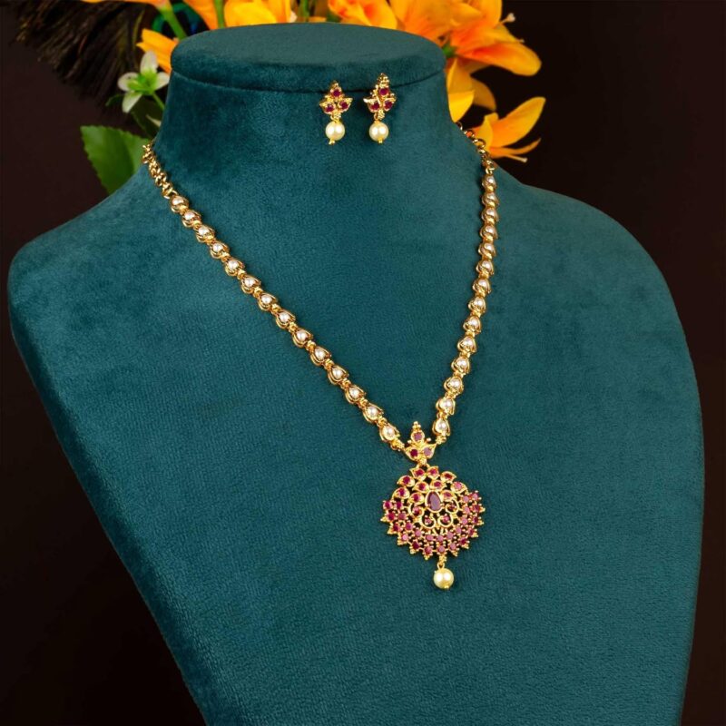Sasitrends Gold Plated Brass 18 Inches Short Pearl Chain with Small Pendant and Tiny Earrings for Women & Girls