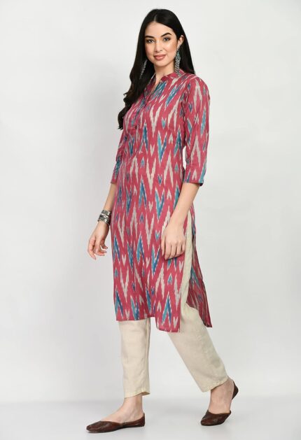 Maurya Women’s Ikkat Print Kurtis for Women | 3/4 Sleeve Cotton Pink Color A line Kurti for Women | Calf Length Straight Kurta for Women (MKT GP 12)