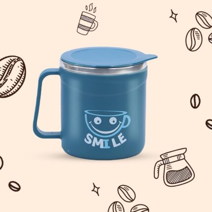 Attro Happy Mug Comes with Double Wall Inner Stainless Still & Lid Stylish Cup Ideal for Hot Coffee, Tea – Blue – Plastic, 300 Ml