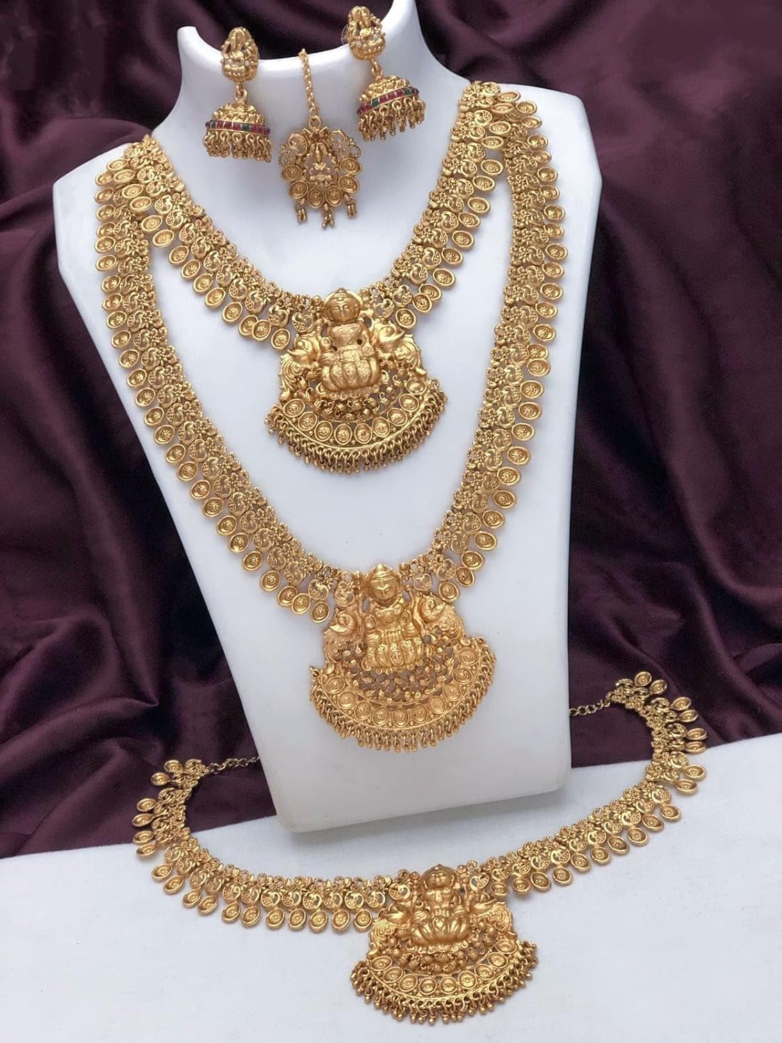 Adc Fashion brings you the latest Lakshmi haram and Lakshmi haram designs with its all new Traditional Long Haram Necklace. This neck piece is lightweight and reflects pure splendour embedded with beautiful colored stones and floral design chain that makes it look extremely feminine and enchanting. Adc Fashion all new Red Gold-Plated Antique Lakshmi Haram for Women is unique and customised handcrafted pieces that exhibit elegance and fine class all at once. You can wear them and increase your beauty to an ultimate stage as there is no other better option that shining in tradition ethinc necklace. You can pair it with your Saree, Salwar and Lehenga and flaunt them to several occasions such as ring ceremony, wedding and festivals. You can also wear it on regular basis. Make your moment memorable with this range. This jewelery set features a unique style that reflects beautifully on every Indian women and girls all around.