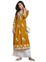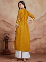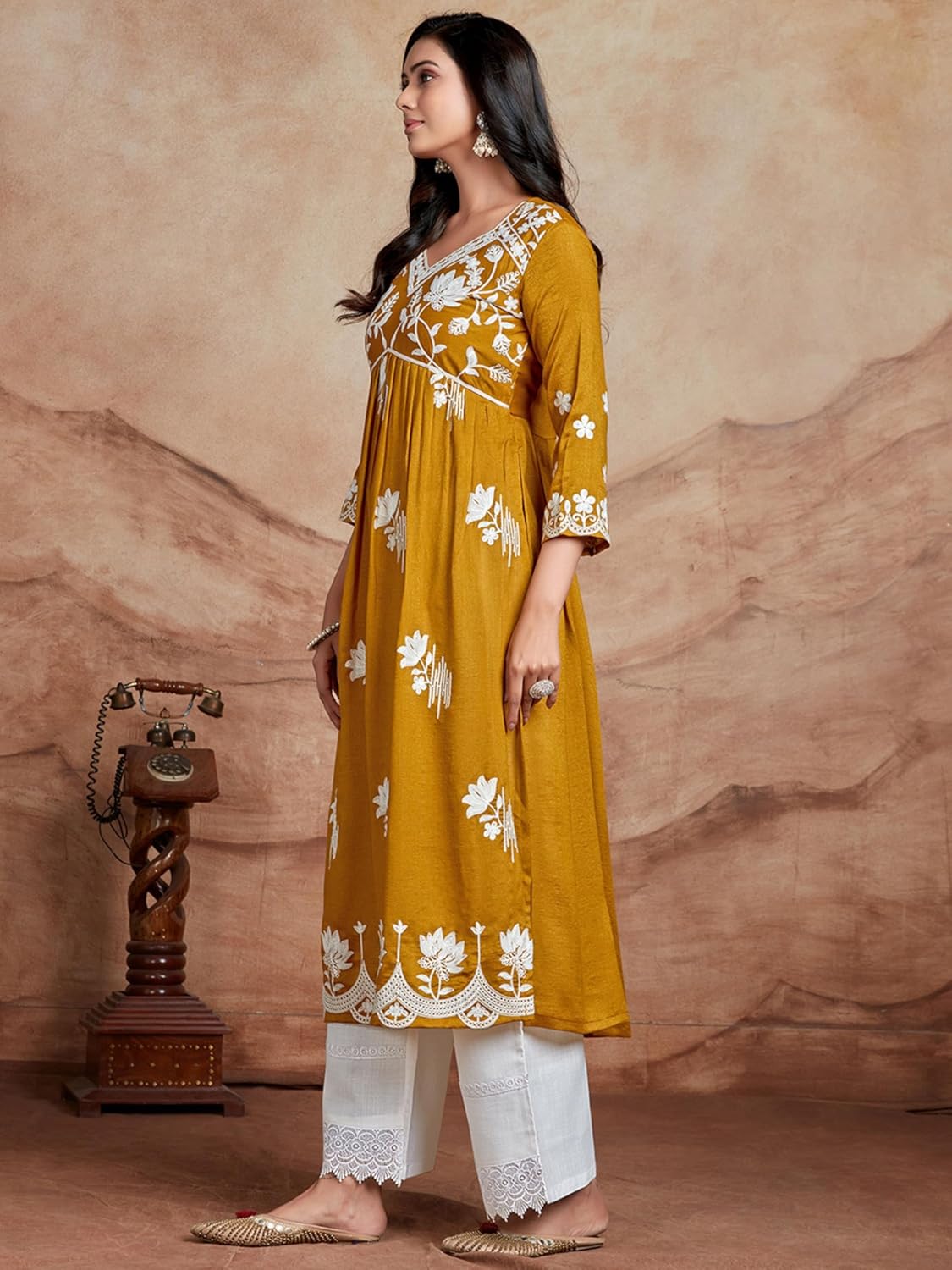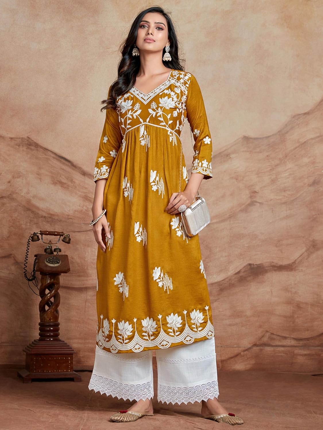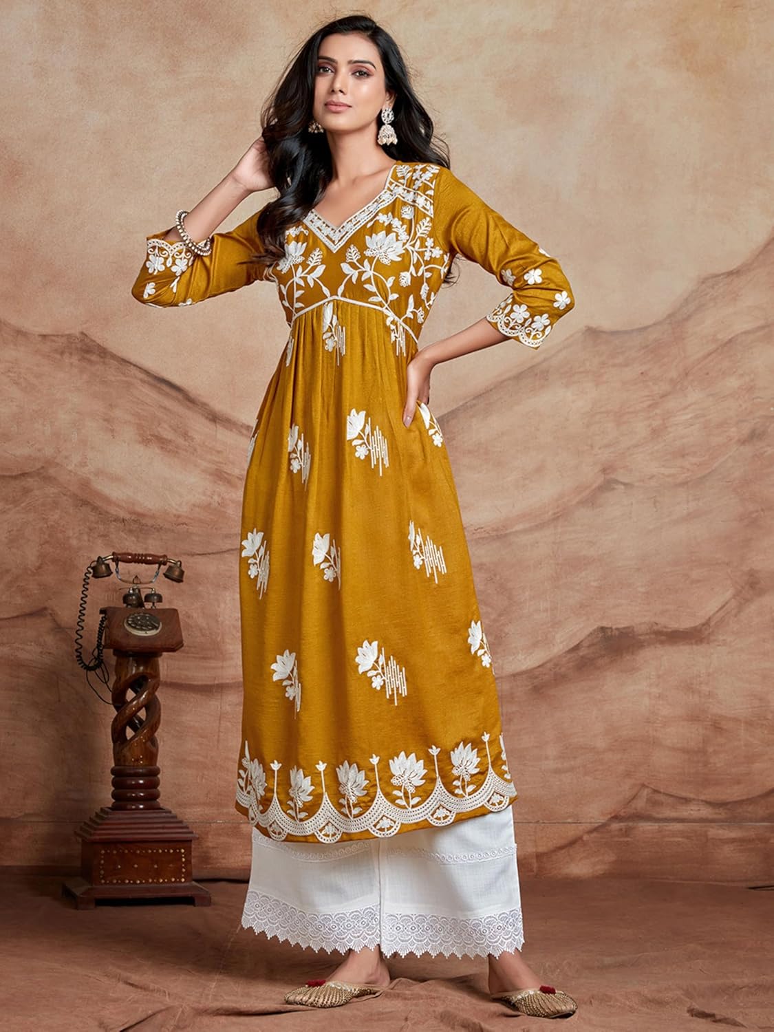 This Kurti Made of Vichitra Silk material And Embroidered Chikankari Work V-Neck.This Kurti is blased on Festive wear this kurti and look pretty all festivals party and special ocassion.