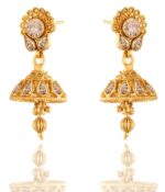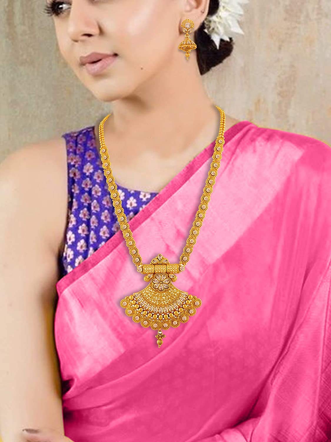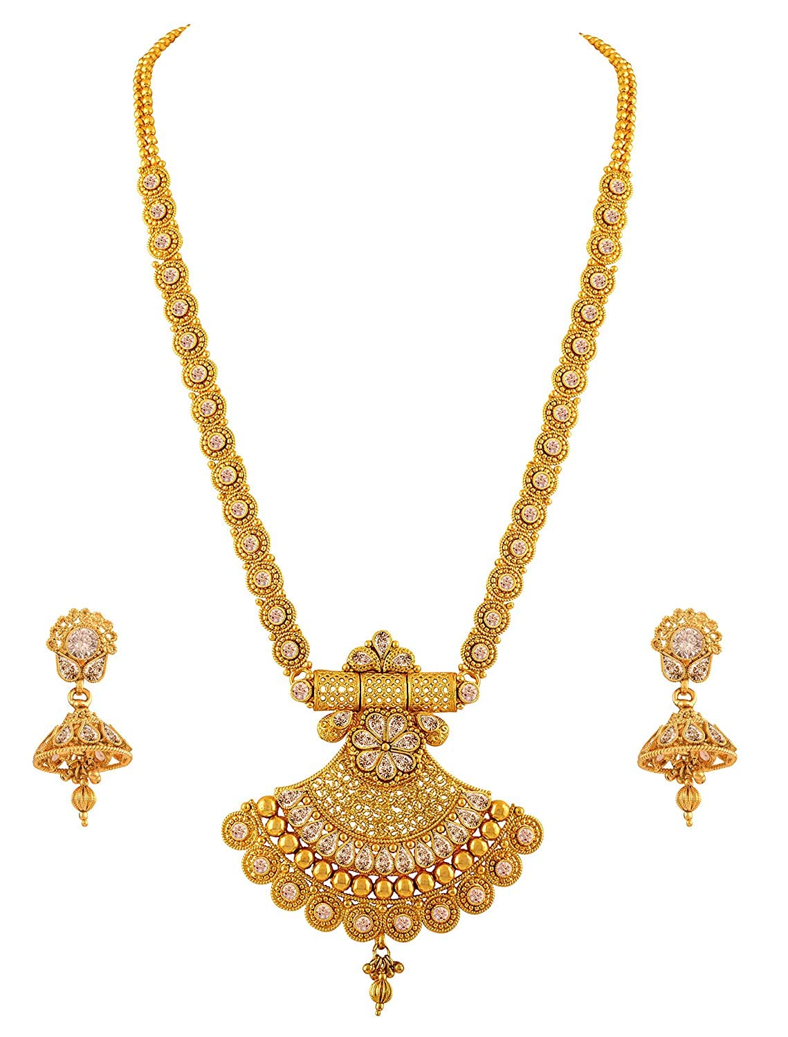 Home Premium Jewelry JFL-Jewellery for Less Long Traditional Ethnic One Gram Gold Plated Floral & Polki American Diamond Designer Bridal Necklace Set with Jhumka Earring for Women and Girls.