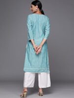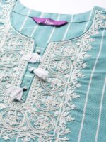 Our blue striped kurta, crafted in cotton fabric, features a U-notched neckline, three-quarter sleeves, and a statement yoke. Adorned with thread work, lace and tassel accents, this style is perfect for casual outings.