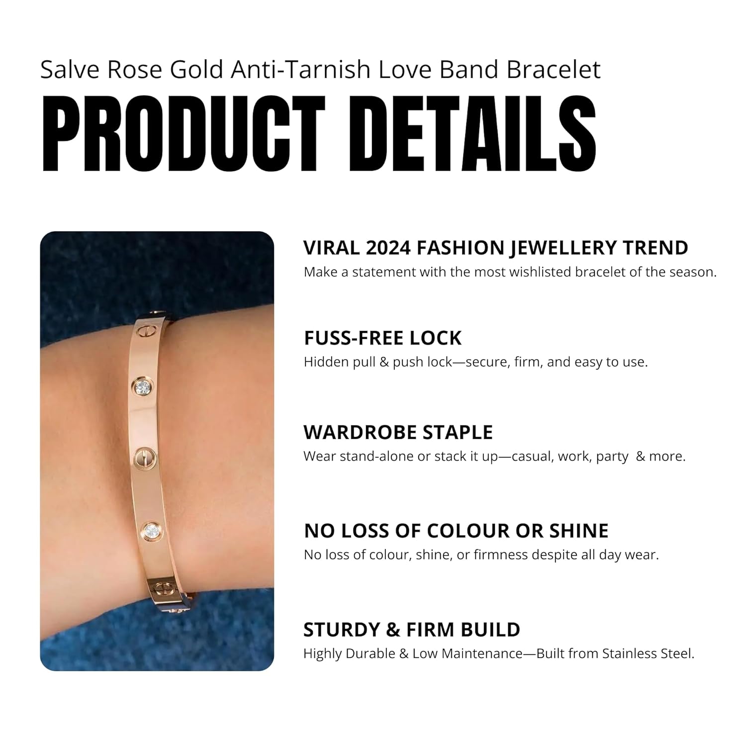 Introducing the exquisite Salve Bangle Bracelet for Women, a harmonious blend of fashion and elegance, meticulously designed to cater to the discerning tastes of modern women. Crafted from stainless steel and adorned with cubic zirconia stones, this hypoallergenic girls bracelet stylish new fashion promises both beauty and durability, ensuring this kada bracelet for women remains a cherished accessory. The rose gold finish of this women fashion jewellery korean bracelet for girls exudes a warm, romantic charm. The anti-tarnish properties ensure that our ad bracelet for women retains its lustrous appearance. This tarnish free jewellery ladies bracelet for women stylish is a statement of style. The minimalist design makes this bracelet bangle for woman suitable for various outfits. Whether you’re looking for aesthetic bracelets for girls, a bracelet for girlfriend, a simple bracelet for women, dainty bracelets for women, cute bracelets, hand bands for women, bracelets for girls stylish, crystal bracelets for women, bracelets for women stylish, daily wear bracelets for women, bangles and bracelets, hand jewellery for women, women accessories for gift, stone bracelets for women, rose gold jewellery, cute jewellery for girls, bangles for women gold, bracelet for sister, women bracelets, gifts for women special unique, charm bracelets for women, pink bracelet for women, minimal jewellery for women, aesthetic accessories single bangles for women, cute accessories for women, western jewellery or daily wear bangles for women, our cuff bracelet will suit all your styling needs. Our coquette jewellery for women stylish bracelet for girl is perfect for women who appreciate the finer things. The combination of stainless steel and zirconia creates a stunning visual appeal, making this women bracelet a standout piece in any korean jewellery collection. Elevate your accessory game with the Salve Hand Cuff Bracelet for Women – a timeless aesthetic bracelet that embodies elegance.