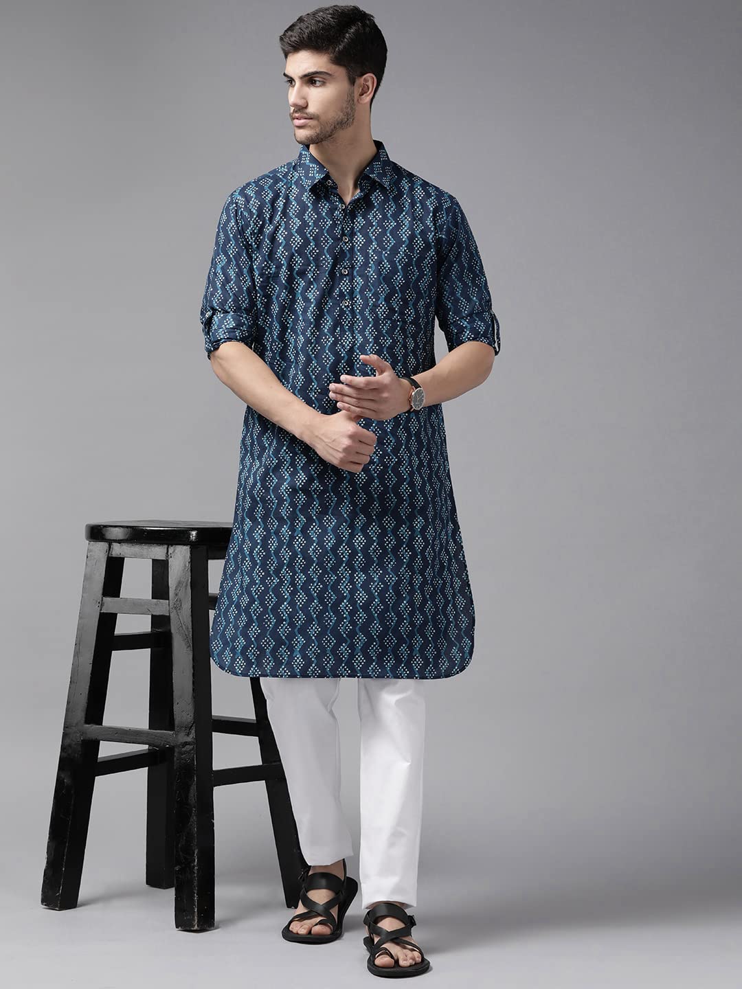 See Designs Men’s Indigo Regular Pure Cotton Pathani Printed Men’s Kurta