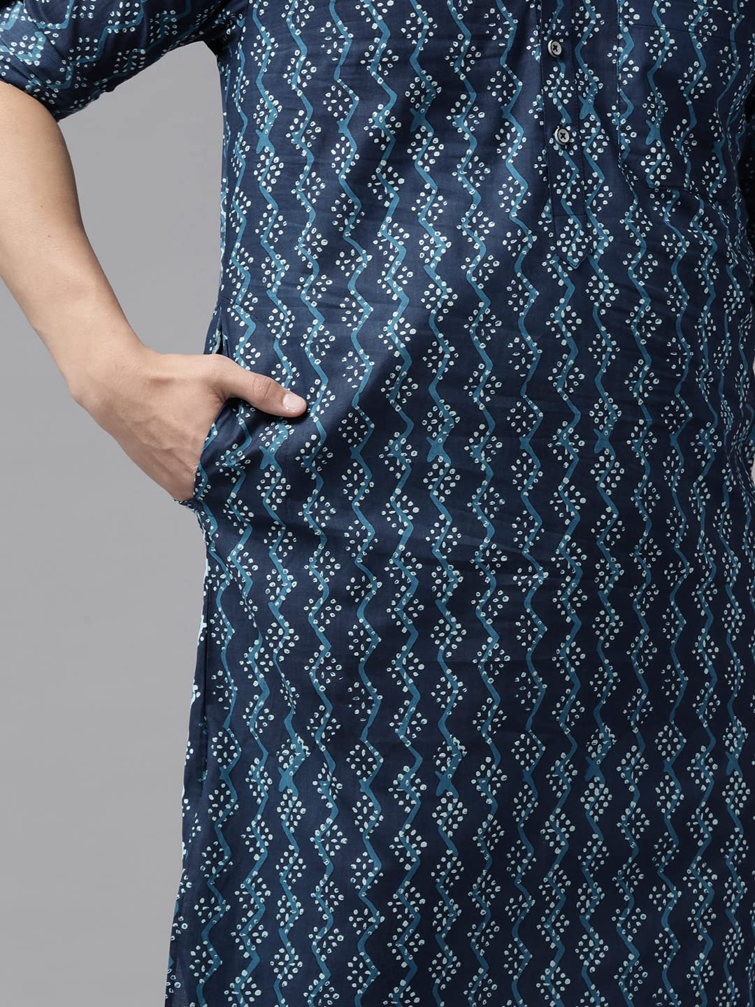 Indigo printed Pathani Curved kurta, has a shirt collar, button closures, long sleeves, 2 Pockets, side slits and Curved hem